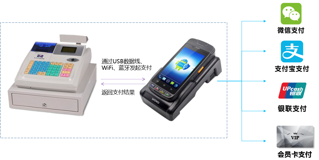 名创收银机通过USB数据线(wifi、蓝牙)连接方式向优博讯pos发起支付(微信、支付宝、银行卡、会员卡等),优博讯pos消费完成后返回支付结果给名创收银系统,pos聚合支付完美和收银机数据实时对接,快速、无差错一体化收银,并且后台ERP数据和收银系统数据实时同步,实时退换货、平账、对账,实现系统高效管理。